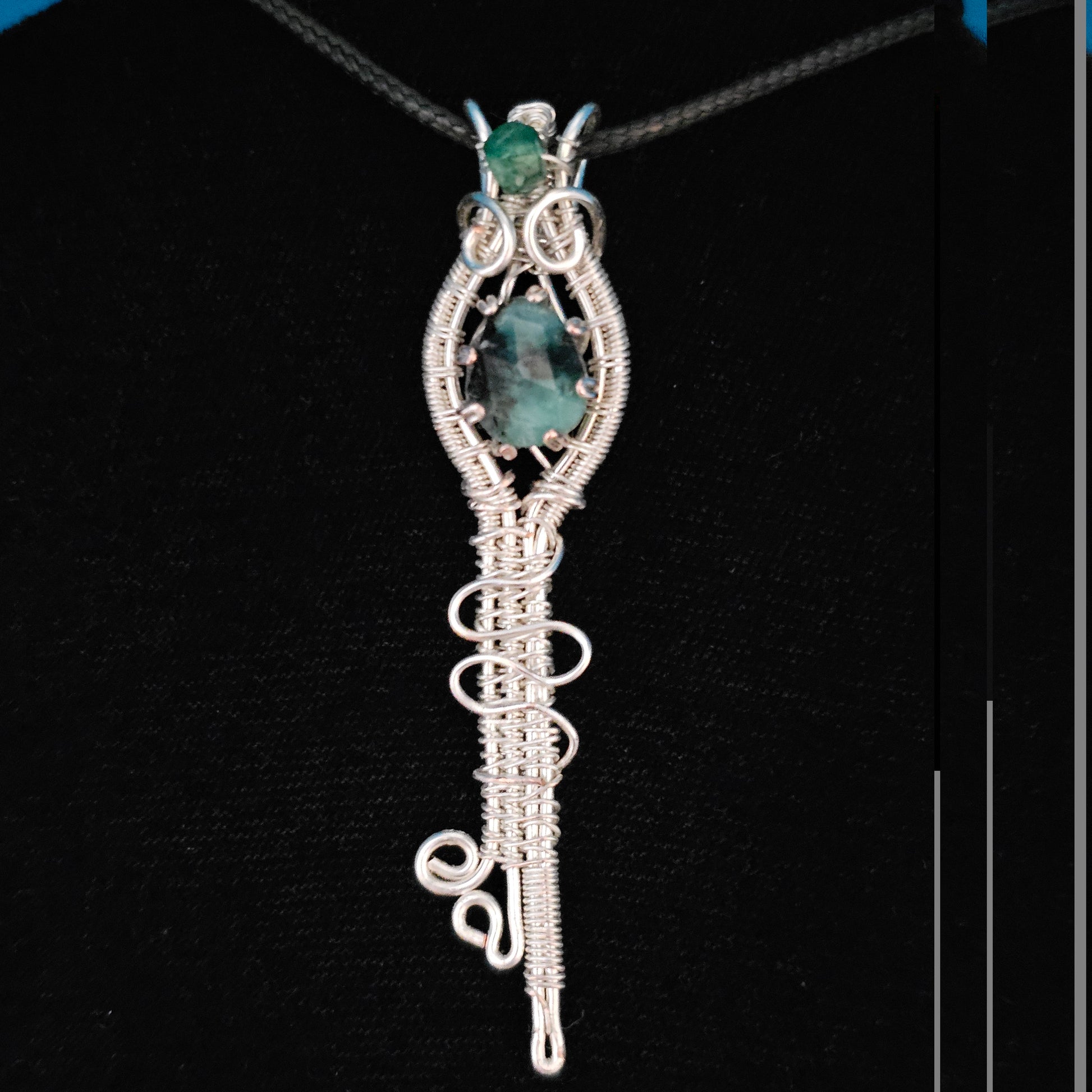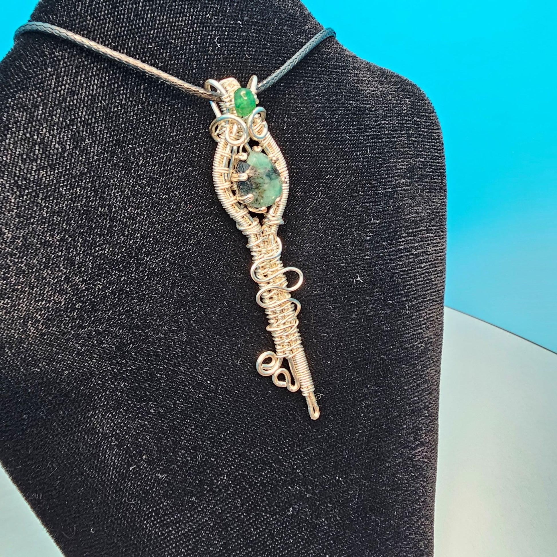 Materials: Natural emerald cabochon, natural green aventurine crystal bead, fine copper wire plated with fine silver and coated to prevent tarnishing.