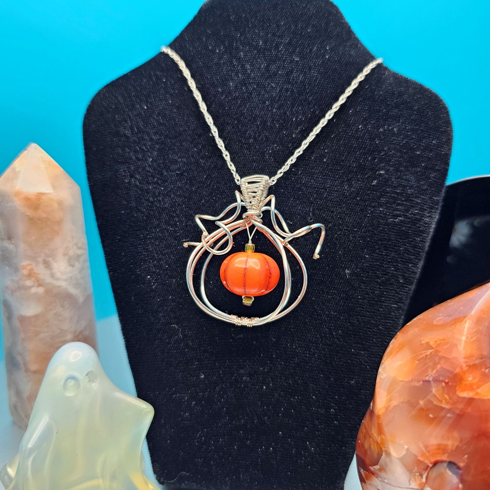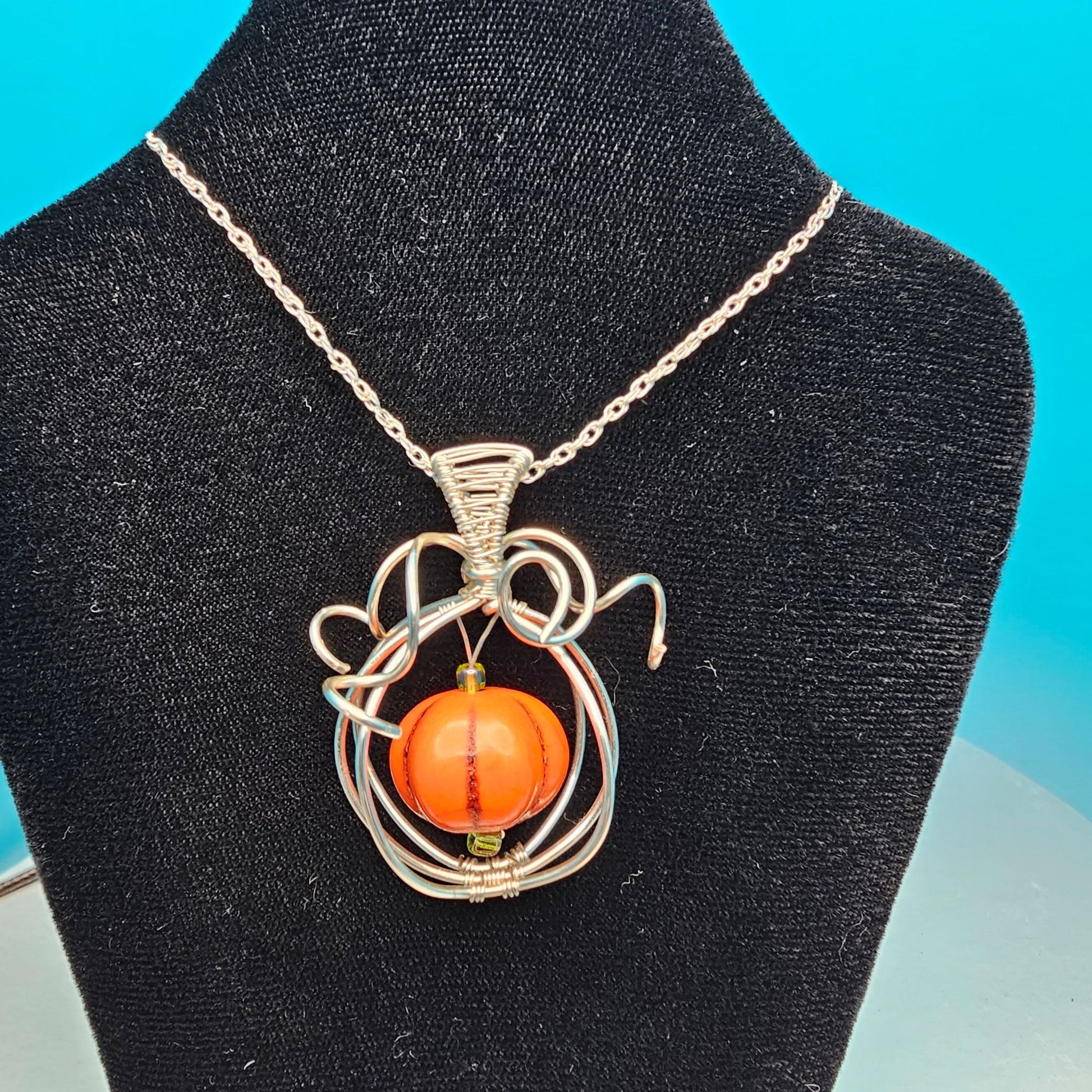 Elevate your autumn style with this elegant pendant featuring a beautiful howlite pumpkin encased in a delicate silver-plated copper frame. Handcrafted with intricate trailing silver vines, this unique piece captures the essence of Halloween and Fall with refined artistry. A one-of-a-kind accessory perfect for adding a seasonal touch to any outfit. This unique and beautiful pendant is suspended from a dainty sterling silver chain.